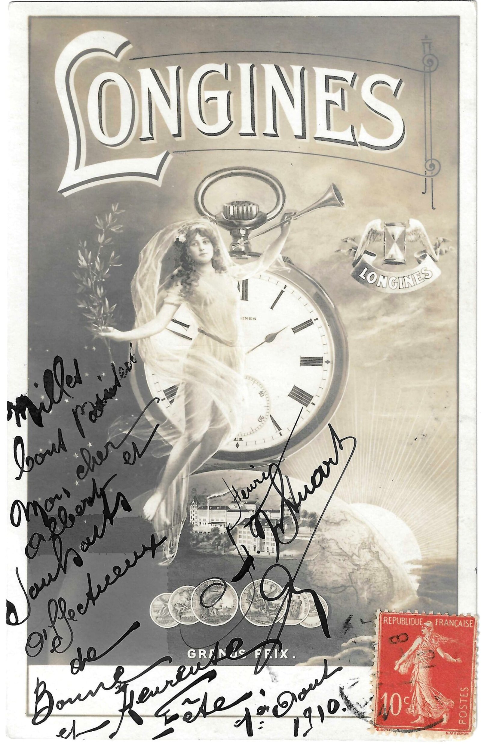 This postcard marks a turning point. You can still see the factory in Saint-Imier, still see references to the international awards Longines had won. But something new has entered the picture: allegory.