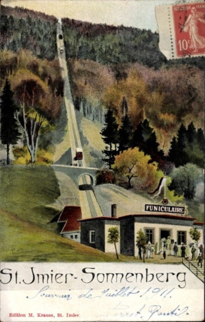 In 1903, a funicular railway connected Mont-Soleil with Saint-Imier—an important infrastructural milestone that was soon reflected in contemporary visual culture.